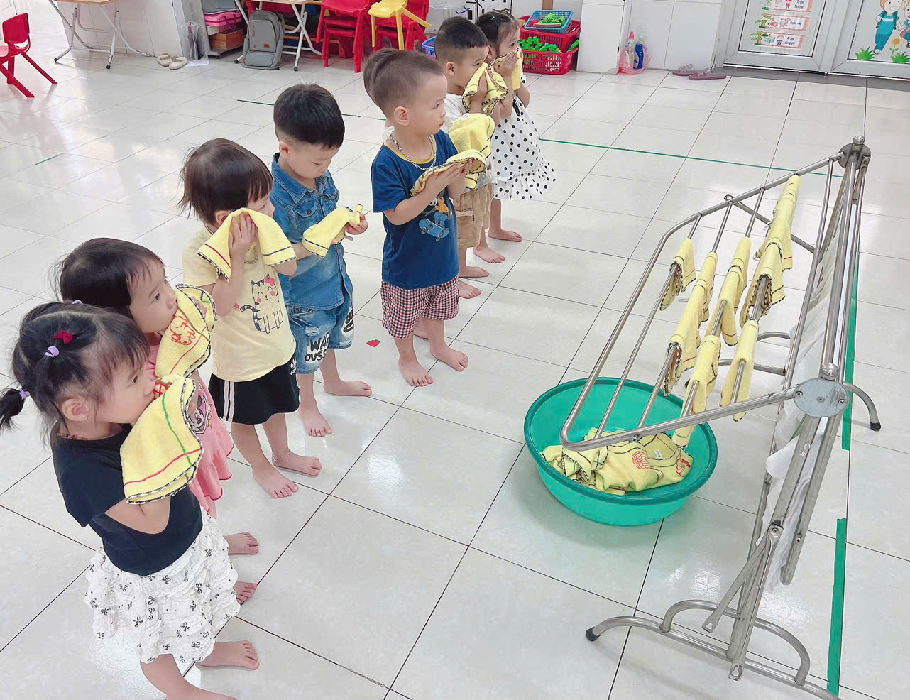 Dưới đây là một số hình ảnh của các bạn nhỏ lớp mẫu giáo bé C4 khi các con được tham gia các hoạt động rèn luyện các kĩ năng phơi khăn, nhận dấu khăn, kĩ năng lau mặt, lau miệng tại lớp.