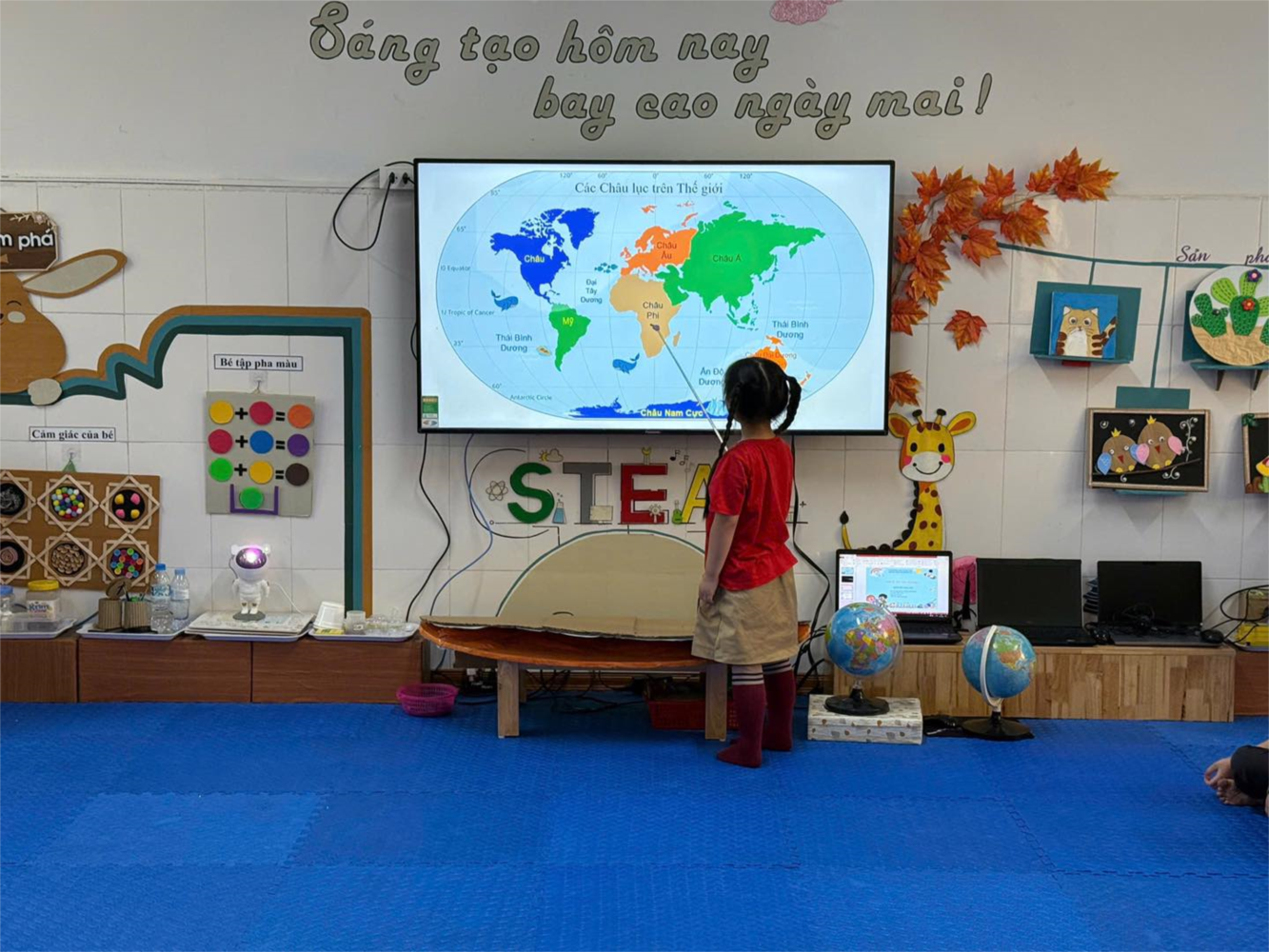 Hôm nay, các bạn nhỏ lớp Mẫu giáo lớn A4 (5–6 tuổi) đã có một hành trình vô cùng thú vị khi cùng nhau khám phá các châu lục trên Trái Đất