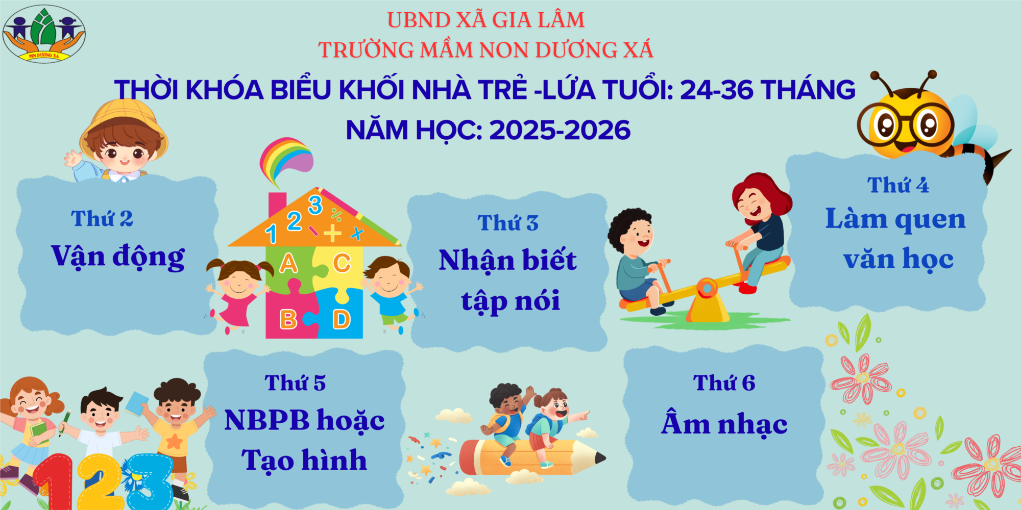 Thời khóa biểu của khối Nhà trẻ được xây dựng khoa học, phù hợp với đặc điểm phát triển của trẻ 24–36 tháng. Các hoạt động trong ngày được sắp xếp hợp lý, xen kẽ giữa học tập – vui chơi – ăn – ngủ, giúp trẻ phát triển toàn diện cả về thể chất, ngôn ngữ, nhận thức, tình cảm và kỹ năng xã hội.