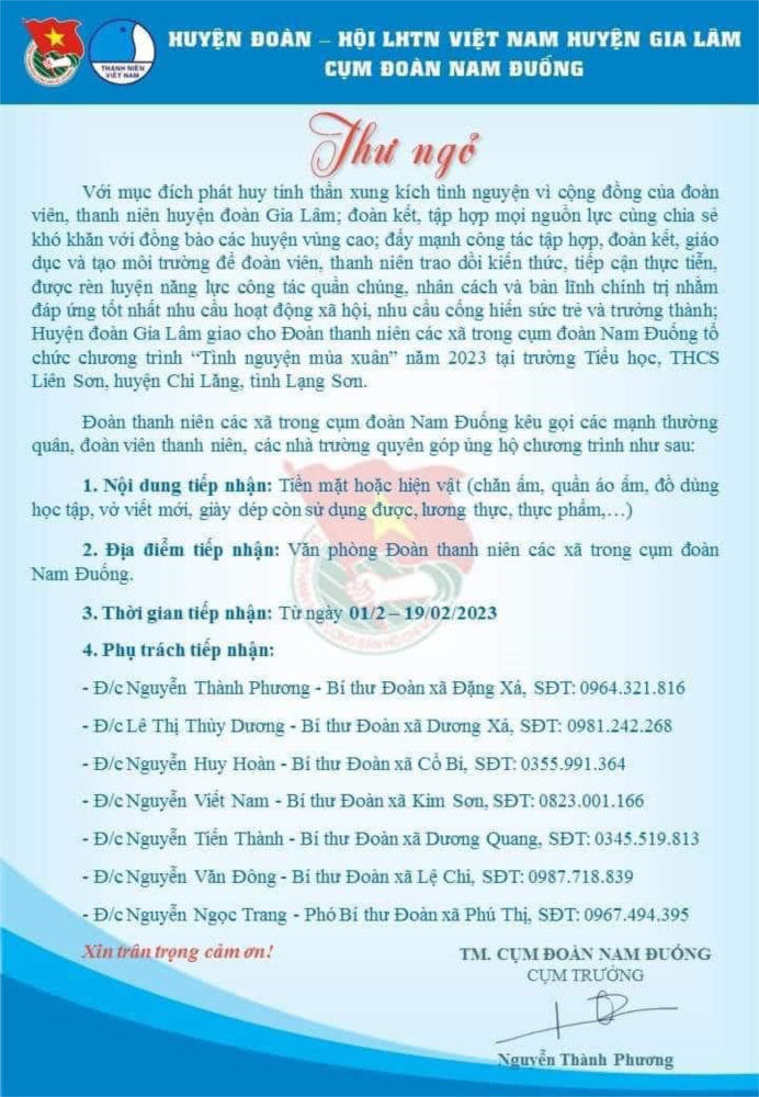 Đoàn TNCS Hồ Chí Minh MN Dương Xá kêu gọi ủng hộ hiện vật để tặng: