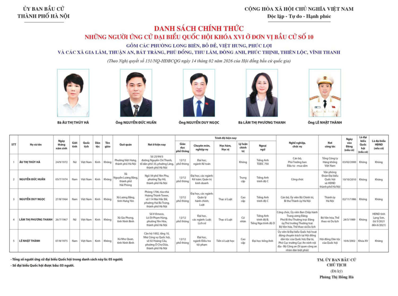 🔸Ngày 20/02/2026, Ủy ban Bầu cử thành phố Hà Nội đã ban hành Quyết định số 48/QĐ-UBBC về việc công bố danh sách chính thức những người ứng cử đại biểu Quốc hội khóa XVI theo từng đơn vị bầu cử tại thành phố Hà Nội.