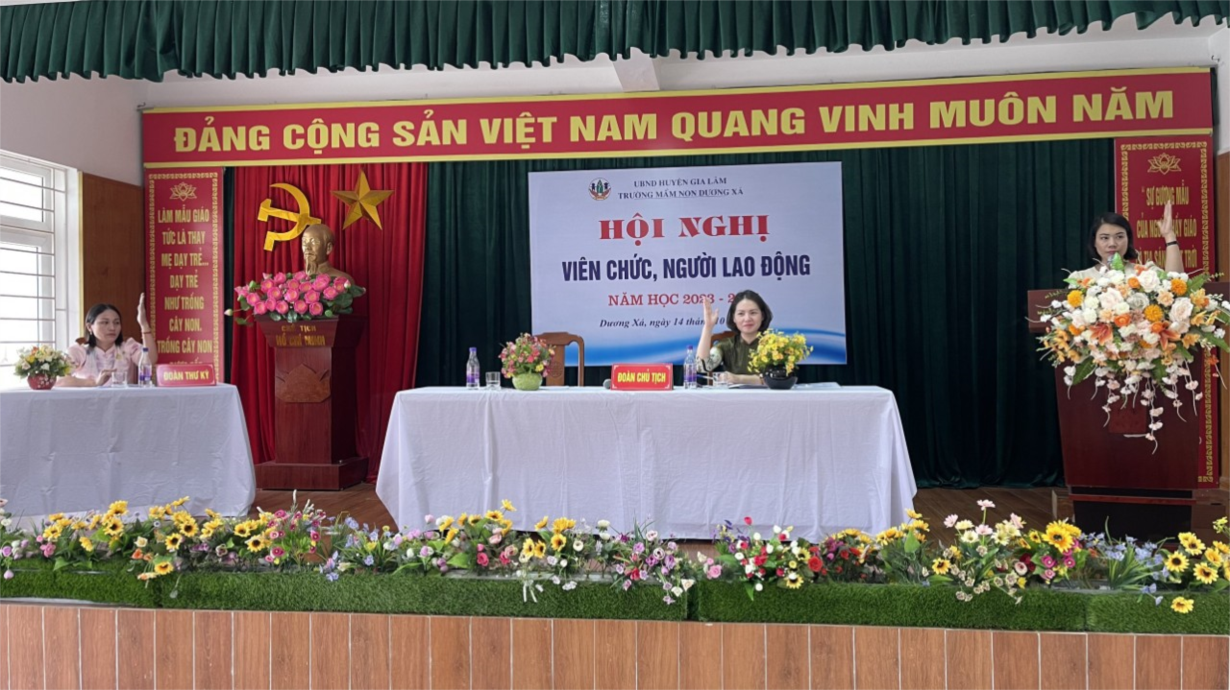 "Hội nghị cán bộ, công chức, viên chức, người lao động năm học 2023 - 2024" của Trường Mầm non Dương Xá đã thành công tốt đẹp trong không khí đoàn kết, thống nhất của cán bộ, viên chức và người lao động. Tập thể trường MN Dương Xá quyết tâm giữ vững và phát huy những thành tích đã đạt được.