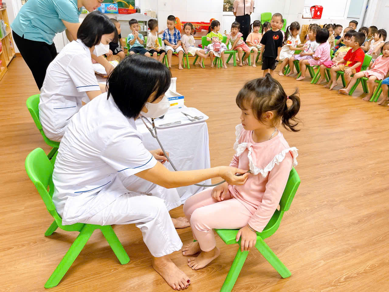 Dưới sự nhiệt tình chu đáo của đội ngũ các y bác sĩ và giáo viên, các bé đều có tâm lí vô cùng thoải mái và hợp tác tốt với các y bác sĩ trong quá trình khám sức khỏe.