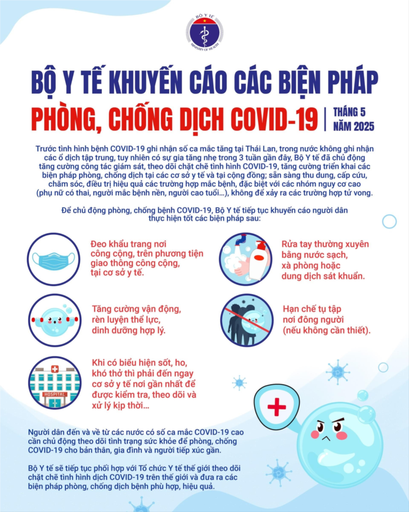 Ngày 15-5, Bộ Y tế đã ra văn bản khuyến cáo các biện pháp phòng, chống dịch Covid-19. Văn bản nêu rõ: Trước tình hình bệnh Covid-19 ghi nhận số ca mắc tăng tại Thái Lan, trong nước không ghi nhận các ổ dịch tập trung, tuy nhiên có sự gia tăng nhẹ trong 3 tuần gần đây, Bộ Y tế đã chủ động tăng cường công tác giám sát, theo dõi chặt chẽ tình hình Covid-19, tăng cường triển khai các biện pháp phòng, chống dịch tại các cơ sở y tế và tại cộng đồng; sẵn sàng thu dung, cấp cứu, chăm sóc, điều trị hiệu quả các trường hợp mắc bệnh, đặc biệt với các nhóm nguy cơ cao (phụ nữ có thai, người mắc bệnh nền, người cao tuổi...), không để xảy ra các trường hợp tử vong.
