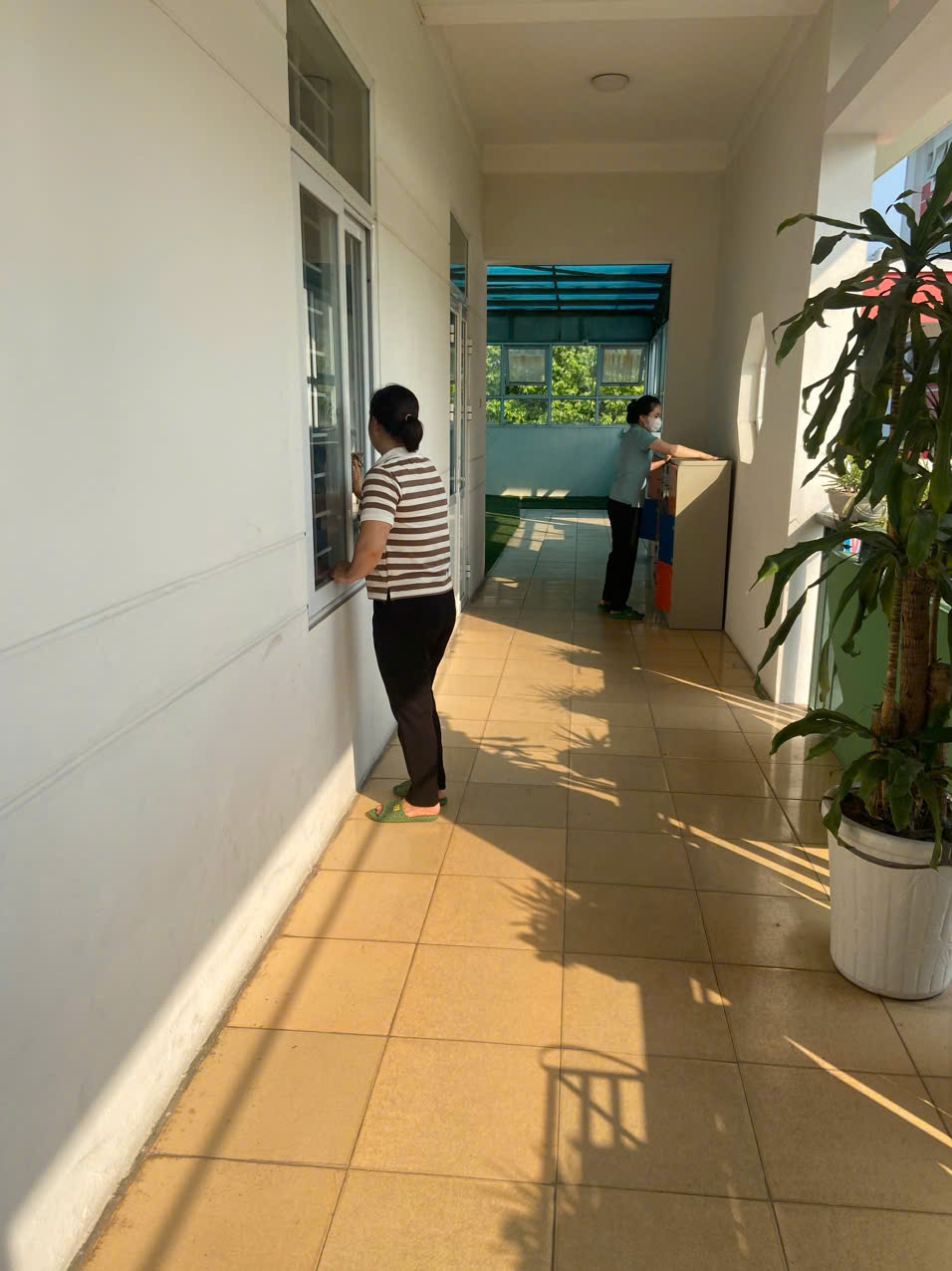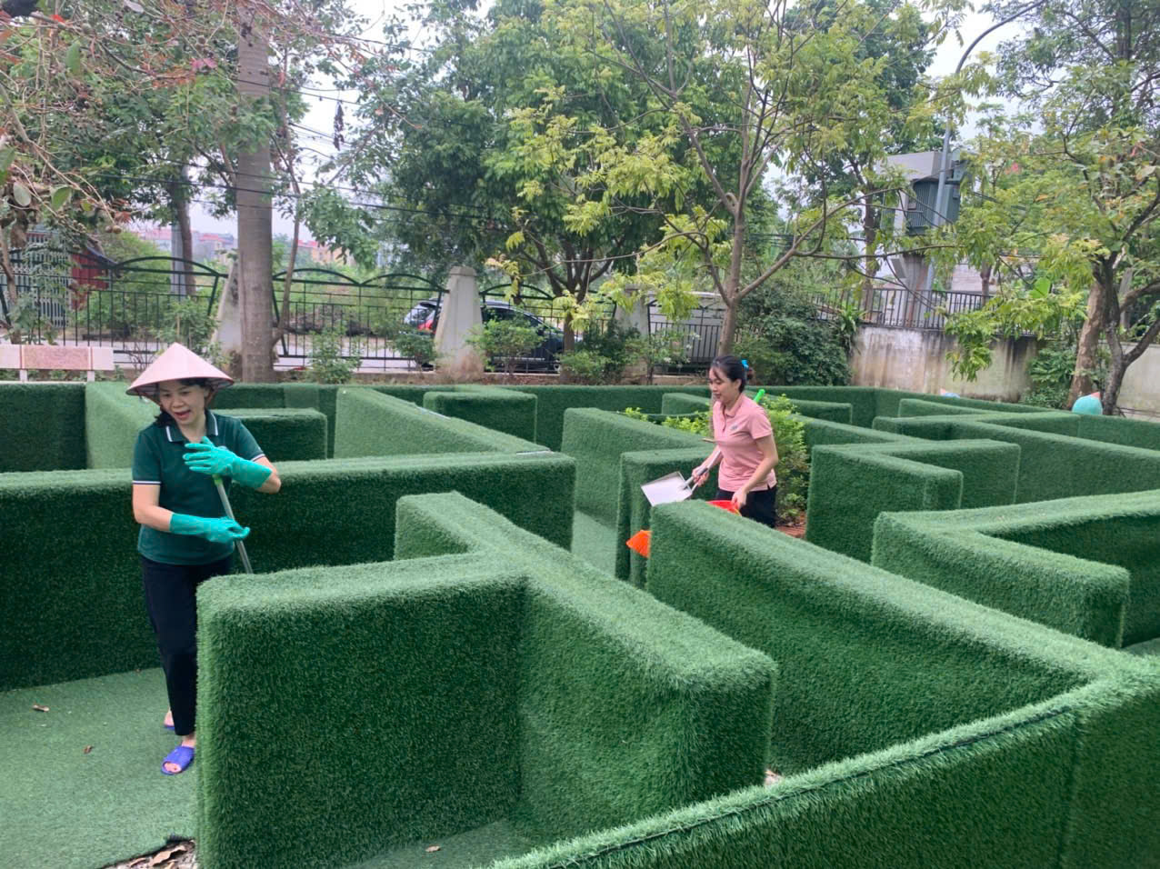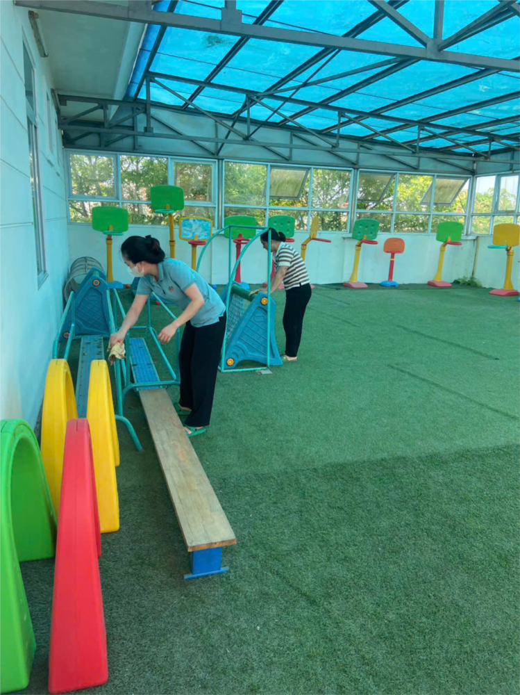 Để chuẩn bị một môi trường an toàn cho trẻ khi bước sang tuần học mới, 100% đội ngũ cán bộ, giáo viên, nhân viên trong nhà trường thực hiện công tác vệ sinh, khử khuẩn nền nhà, hành lang, bàn, ghế, cửa ra vào, cửa sổ, cầu thang, tay nắm cửa, tay vịn cầu thang,…vào chiều thứ Sáu hằng tuần. Tất cả đồ chơi, đồ dùng trong lớp đến đồ chơi ngoài trời, đồ dùng phục vụ công tác chăm sóc bán trú đều được các bác, các cô vệ sinh sạch sẽ.