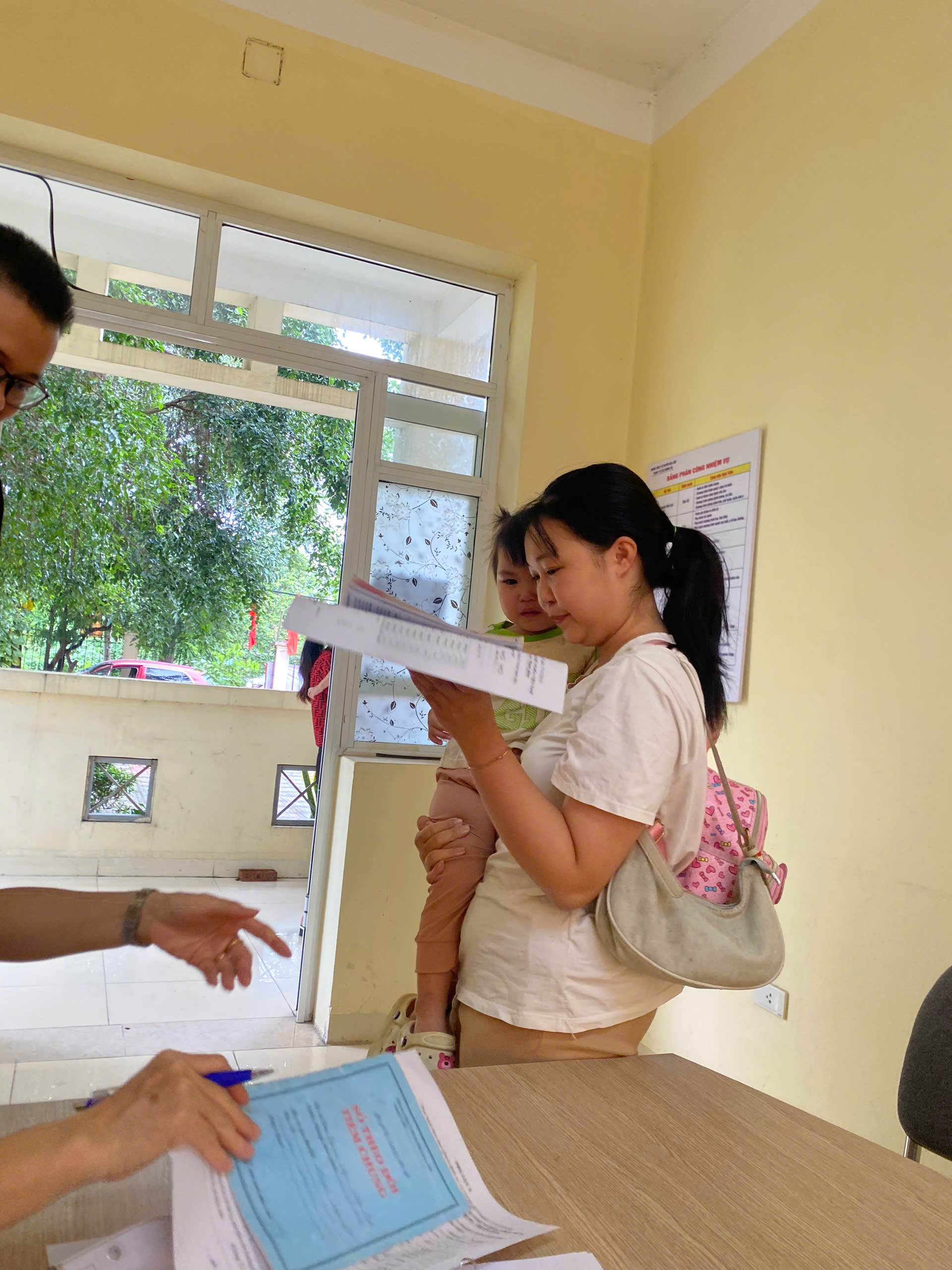 Tại điểm tiêm chủng Trạm y tế xã Dương Xá từ sáng sớm, phụ huynh đã xếp hàng dài chờ tiêm cho con.