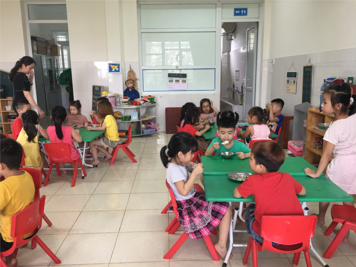 Chăm sóc, nuôi dưỡng trẻ trong trường mầm non là một nhiệm vụ quan trọng giúp trẻ có cơ thể khỏe mạnh. Tổ chức ăn, ngủ, vệ sinh cho trẻ theo đúng quy định của chương trình giáo dục mầm non là rất cần thiết để nâng cao chất lượng chăm sóc, nuôi dưỡng trẻ. Một chế độ dinh dưỡng tốt ngay từ thời thơ ấu sẽ là nền tảng cho sự phát triển cả về thể chất lẫn tinh thần mà chỉ có khi trưởng thành mới có thể biết được. Bên cạnh chế độ dinh dưỡng trong bữa ăn, việc vệ sinh trước, trong và sau khi ăn cũng có phần rất quan trọng trong việc hình thành thói quen cho trẻ, giúp trẻ phát triển toàn diện về nhân cách sau này. Tổ chức giờ ăn hợp lý, bữa ăn được chuẩn bị đầy đủ có trang trí vui mắt, hấp dẫn và sinh động làm trẻ hứng thú, ngon miệng với bữa ăn và dễ dàng ăn hết suất ăn của trẻ, trong quá trình tổ chức giờ ăn cho trẻ cô cần tạo không khí vui vẻ, thoải mái, thông qua giờ ăn cô rèn thêm các kĩ năng tự phục vụ, vệ sinh cá nhân để nâng cao tính tự lập cho trẻ.